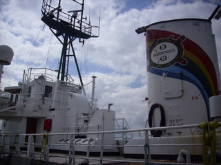 We stayed on the Amstel Botel, moored excitingly right next to the Greenpeace boat (see below). This is on redeveloped docks with a free municipal ferry (carrying city-folk and their bikes) to the train station.