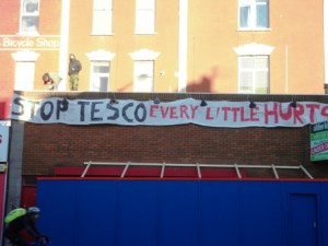 So very grateful for the handpainted banner now draped on the building (see pic above) proclaiming: “Stop Tesco! Every little hurts”.