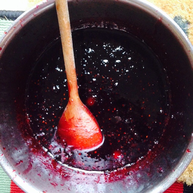Put the blackberries in a saucepan with the water. Get it bubbling for a good 40 minutes until the water is reduced and fruit is soft.