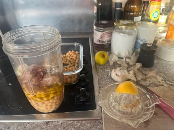 If using a Nutribullet, put the raw garlic in the goblet first with the oil and lemon juice so, when you turn the goblet upside down to whizz it, the blades can crunch down. Then add tahini and cooked chickpeas. Add salt/cumin to taste.