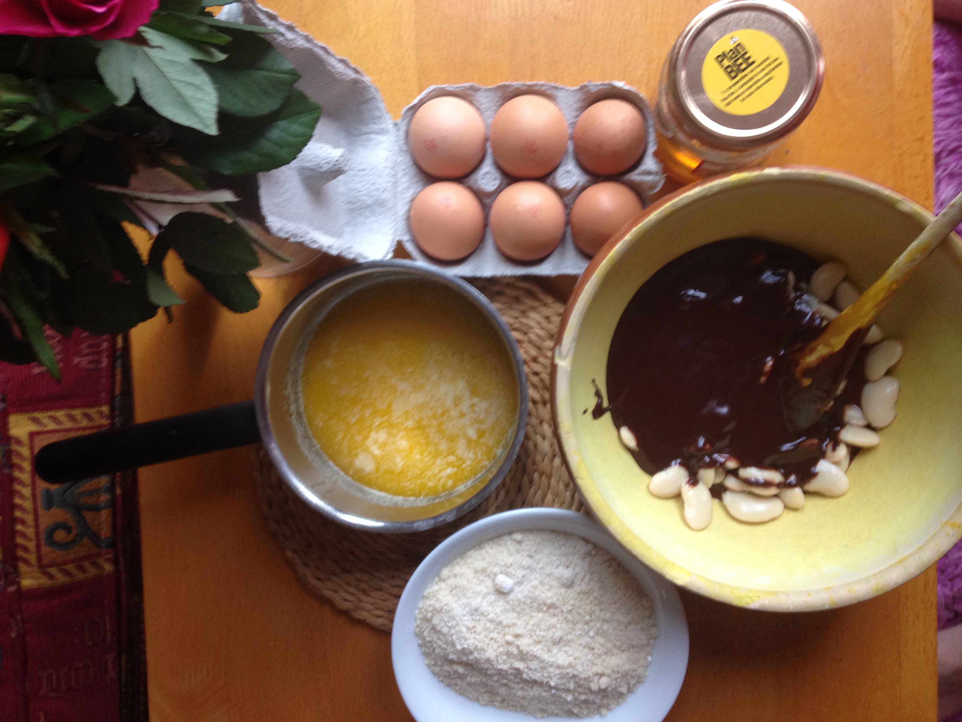 Raw ingredients for bean cake, eggs, melted butter, beans and melted chocolate, ground almonds, pot of honey