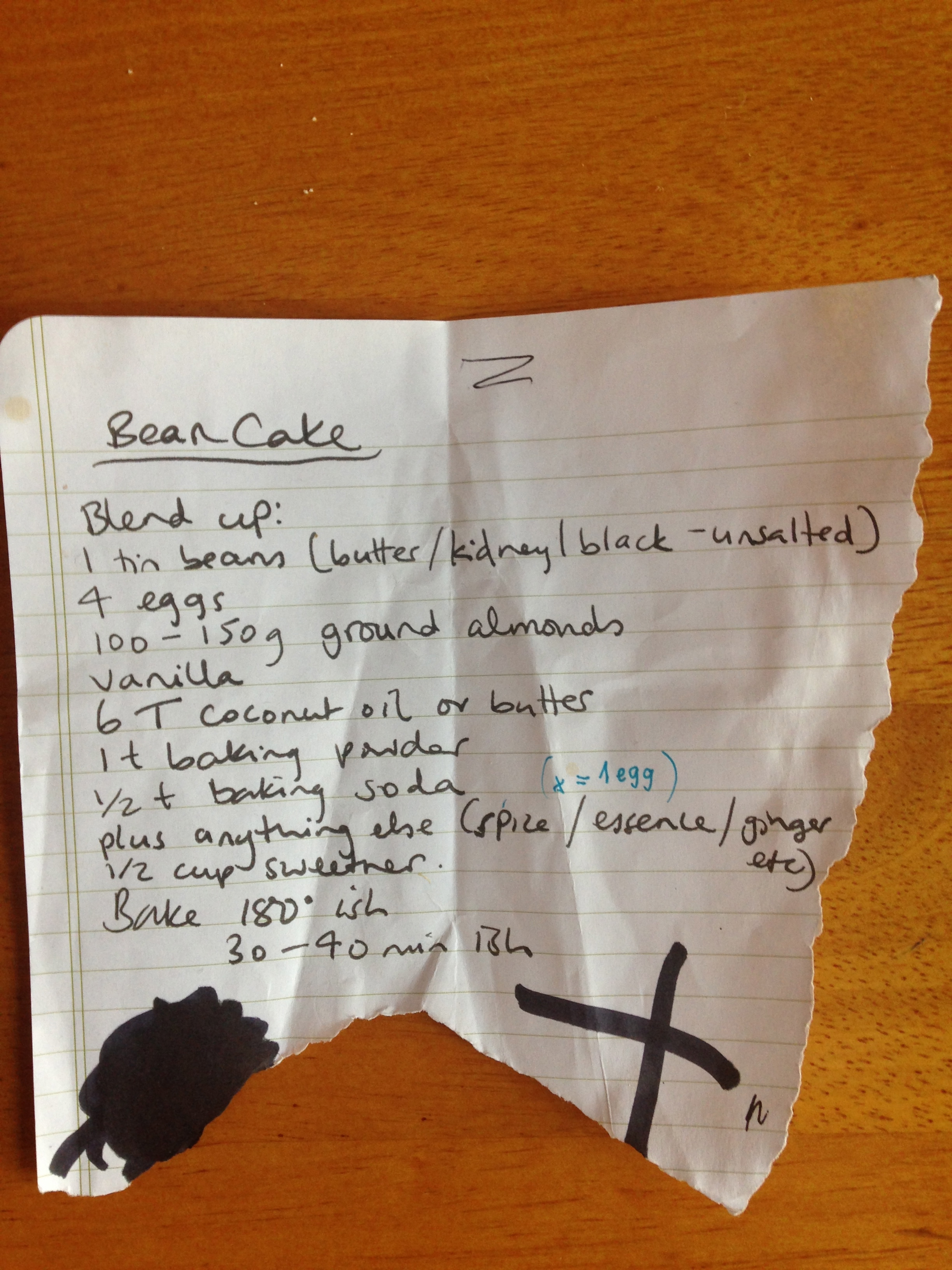 The recipe is thanks to Olea’s mum. Olea and my granddaughter Tayda are schoolchums. After I had contributed a wheat-free raw date and lemon cake to my granddaughter’s 5th birthday party, Olea’s mum wrote out there-and-then a healthy wheat-free recipe (see pic) using…beans.
