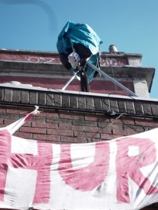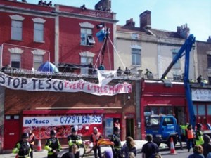 I stood in the cold bright sunshine watching No Tesco squat protestors being removed from the roof by baillifs.