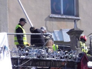 The baillifs used a blue cherry-picker with a crane to get him down.